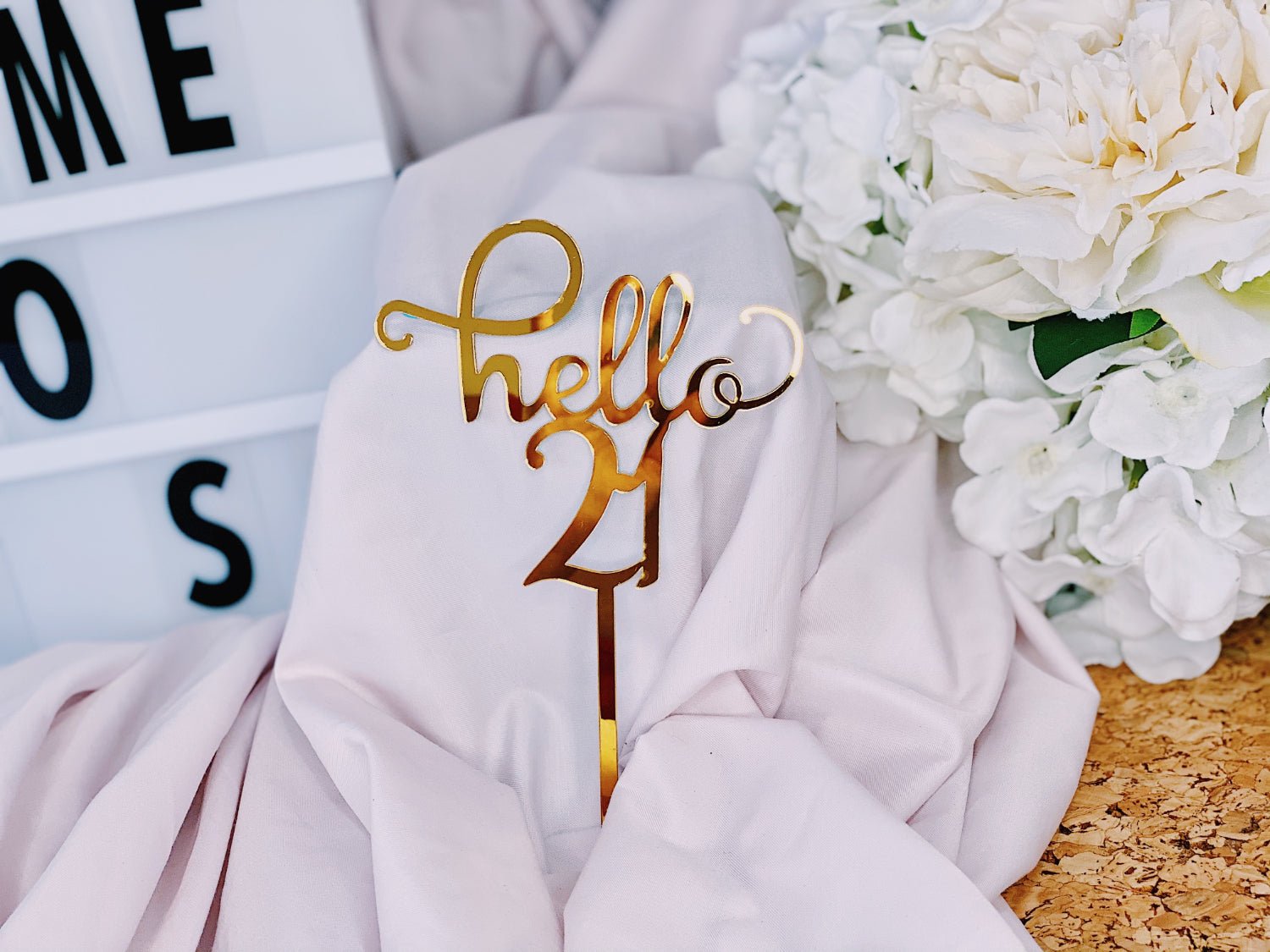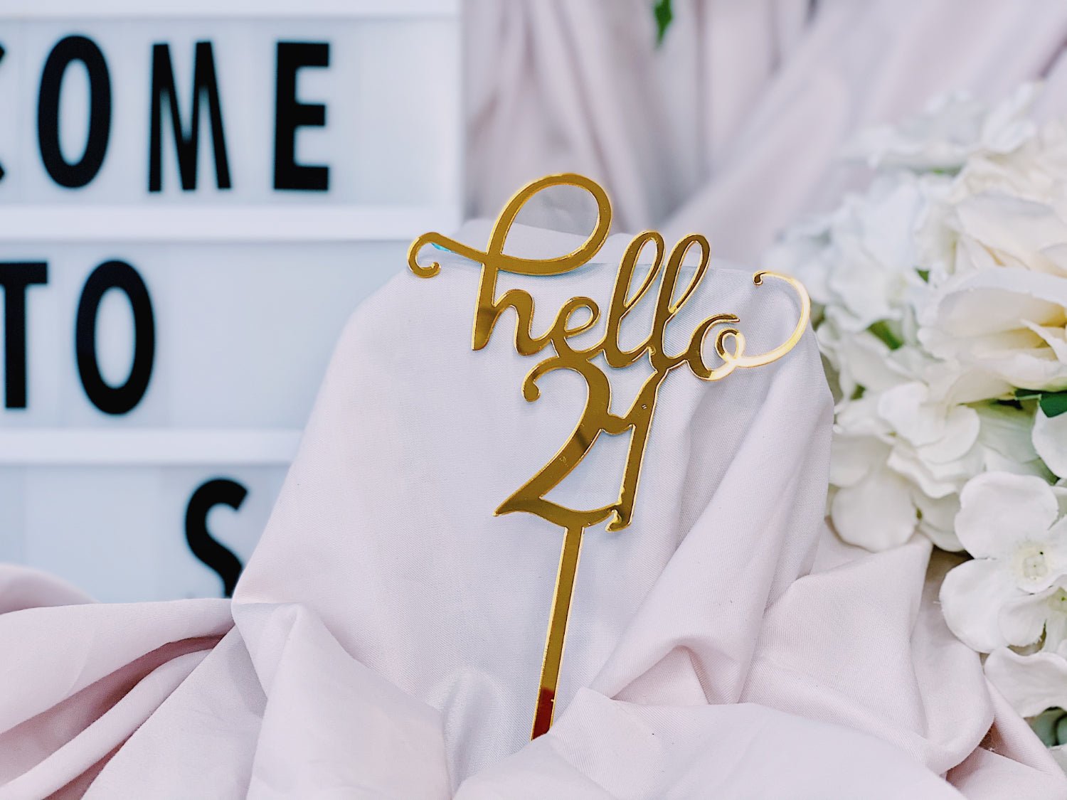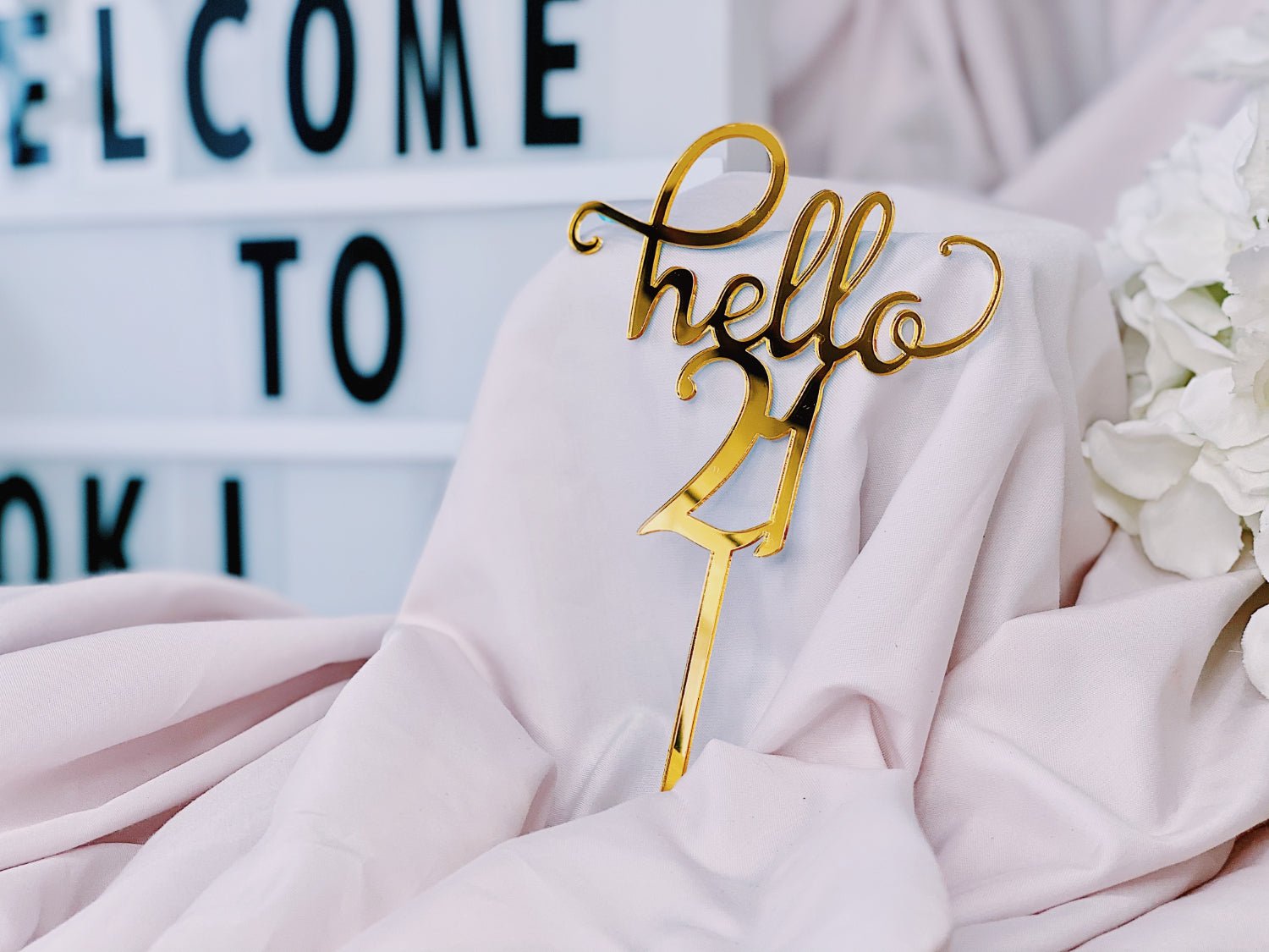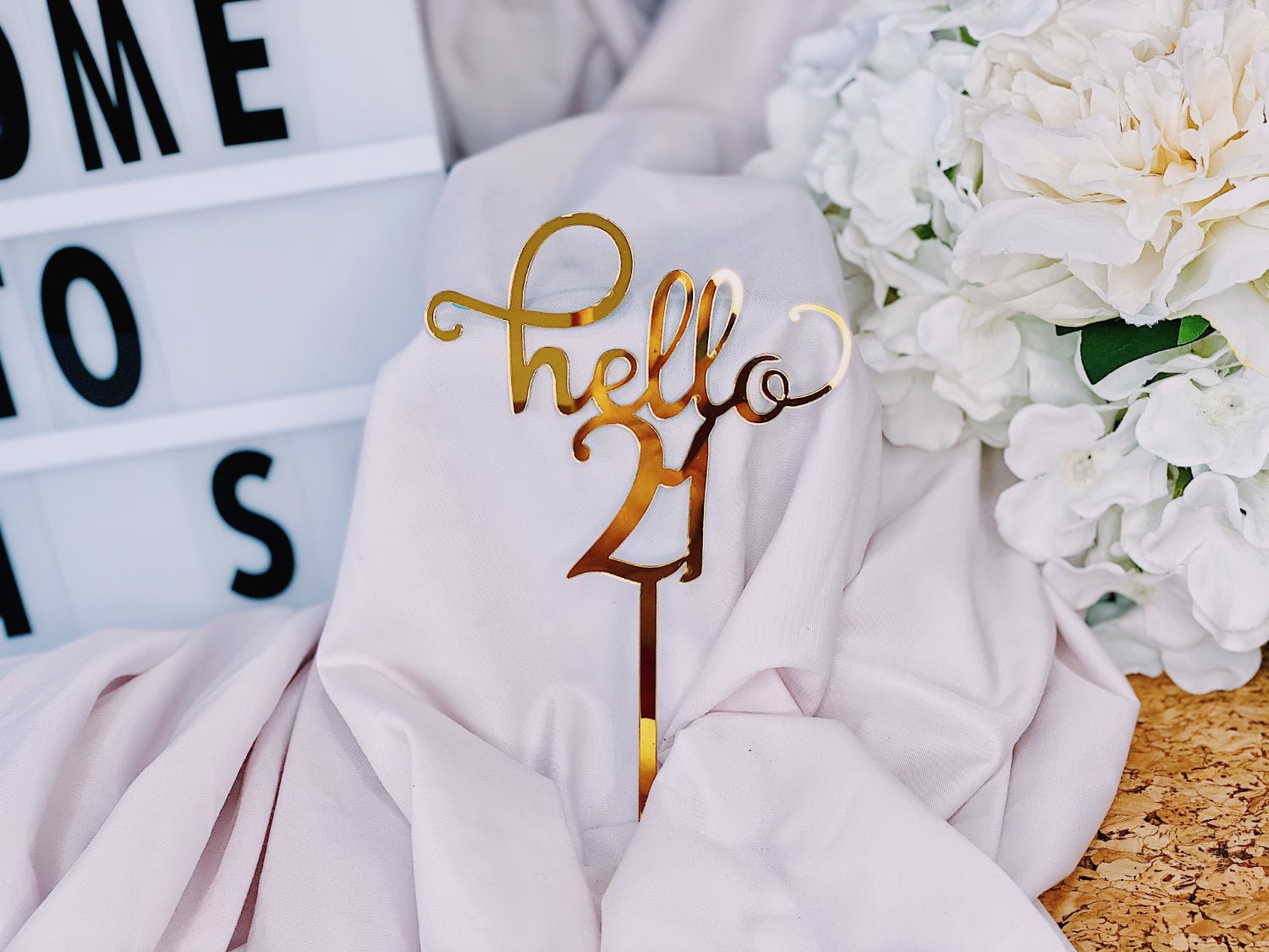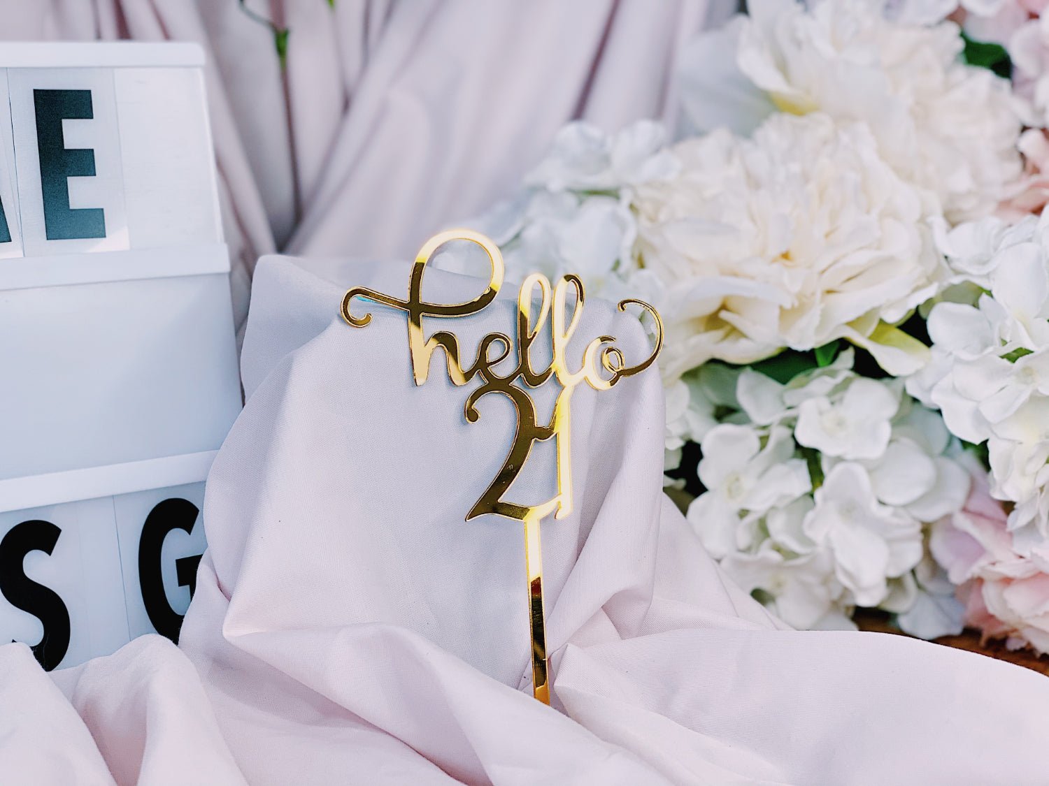 Enhance your flower bouquet with the "Hello 21" Birthday Gold Topper. This elegant add-on adds a celebratory touch, perfect for marking a special 21st birthday. Its gold finish brings a stylish shimmer that complements any floral arrangement effortlessly.