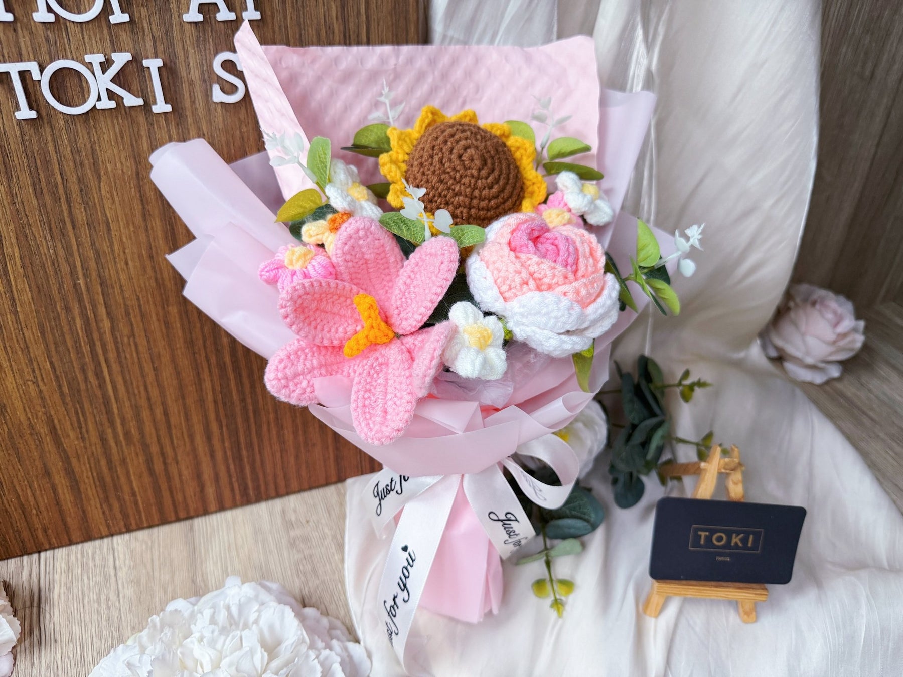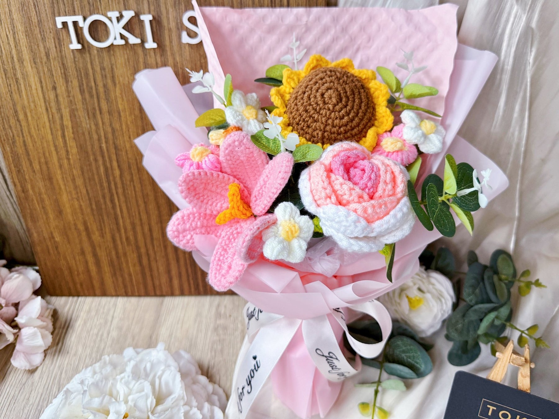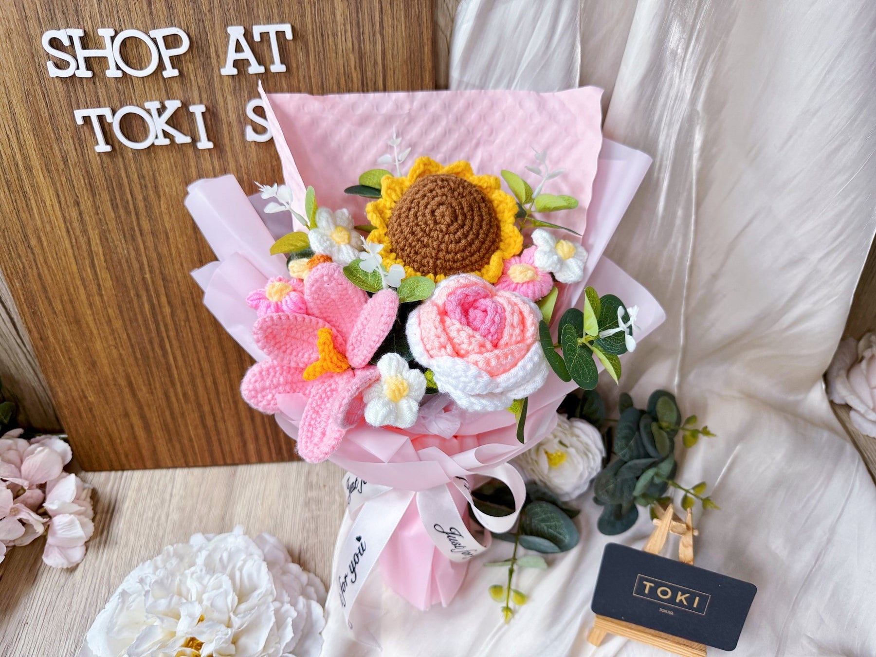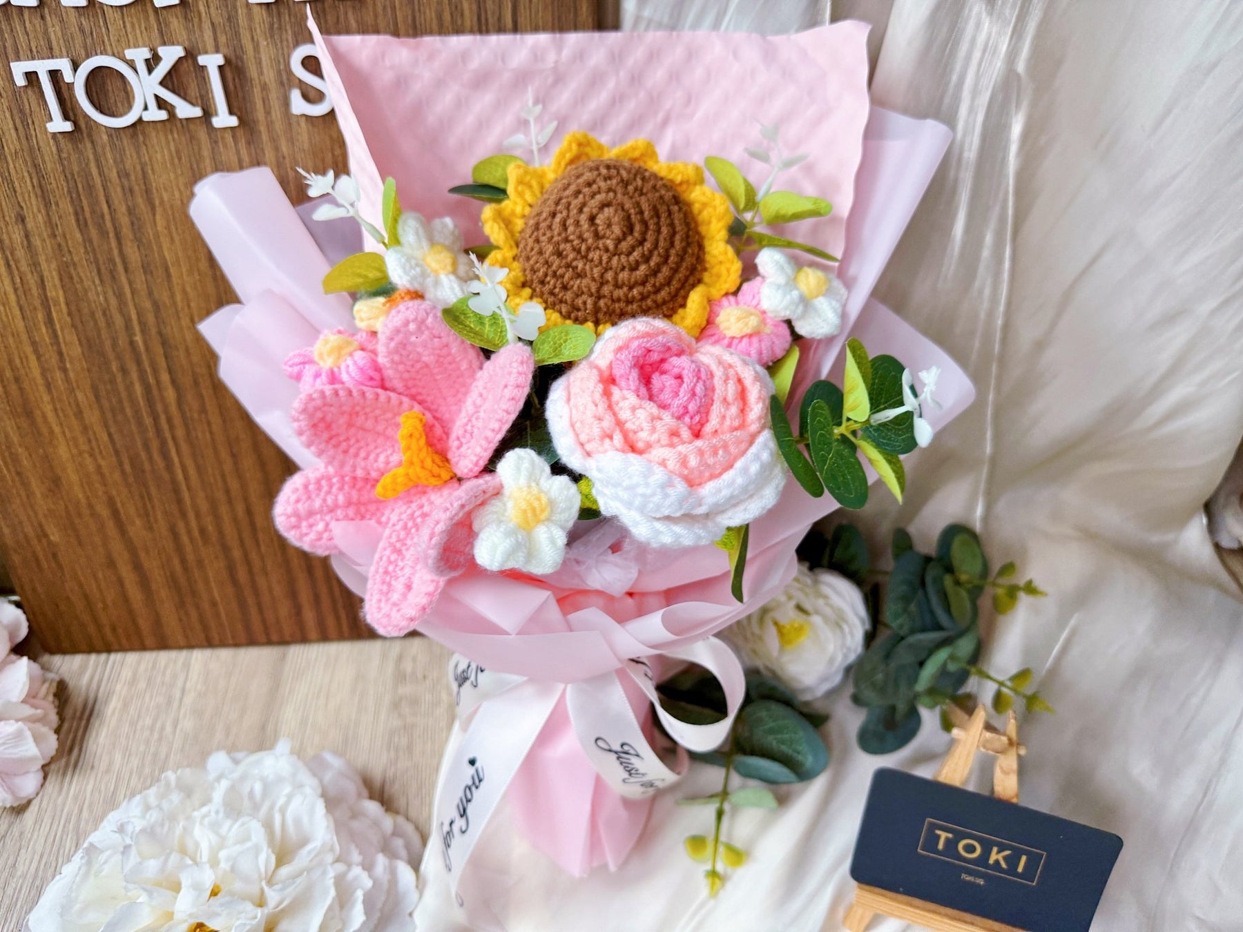 TOKI - Crochet Sunflower, Lily & Rose Bouquet - Pink, Flowers, Birthday / Graduation