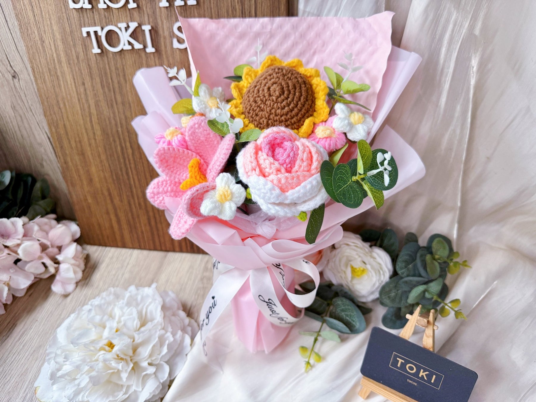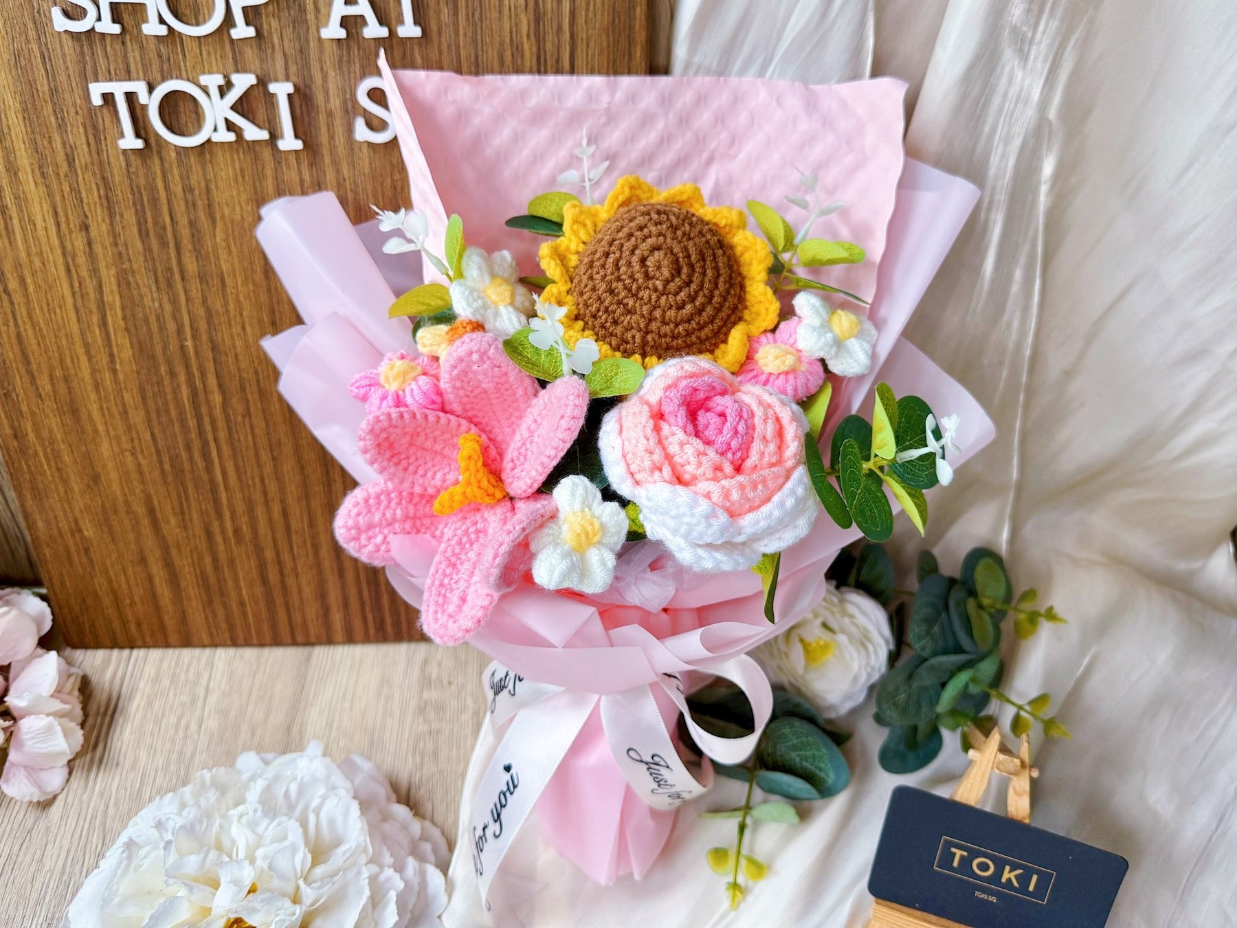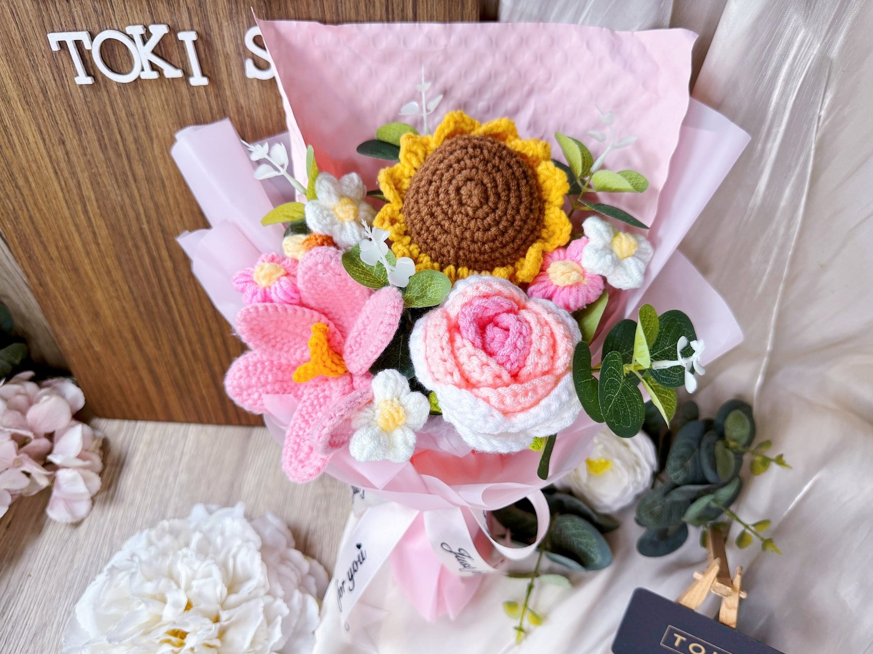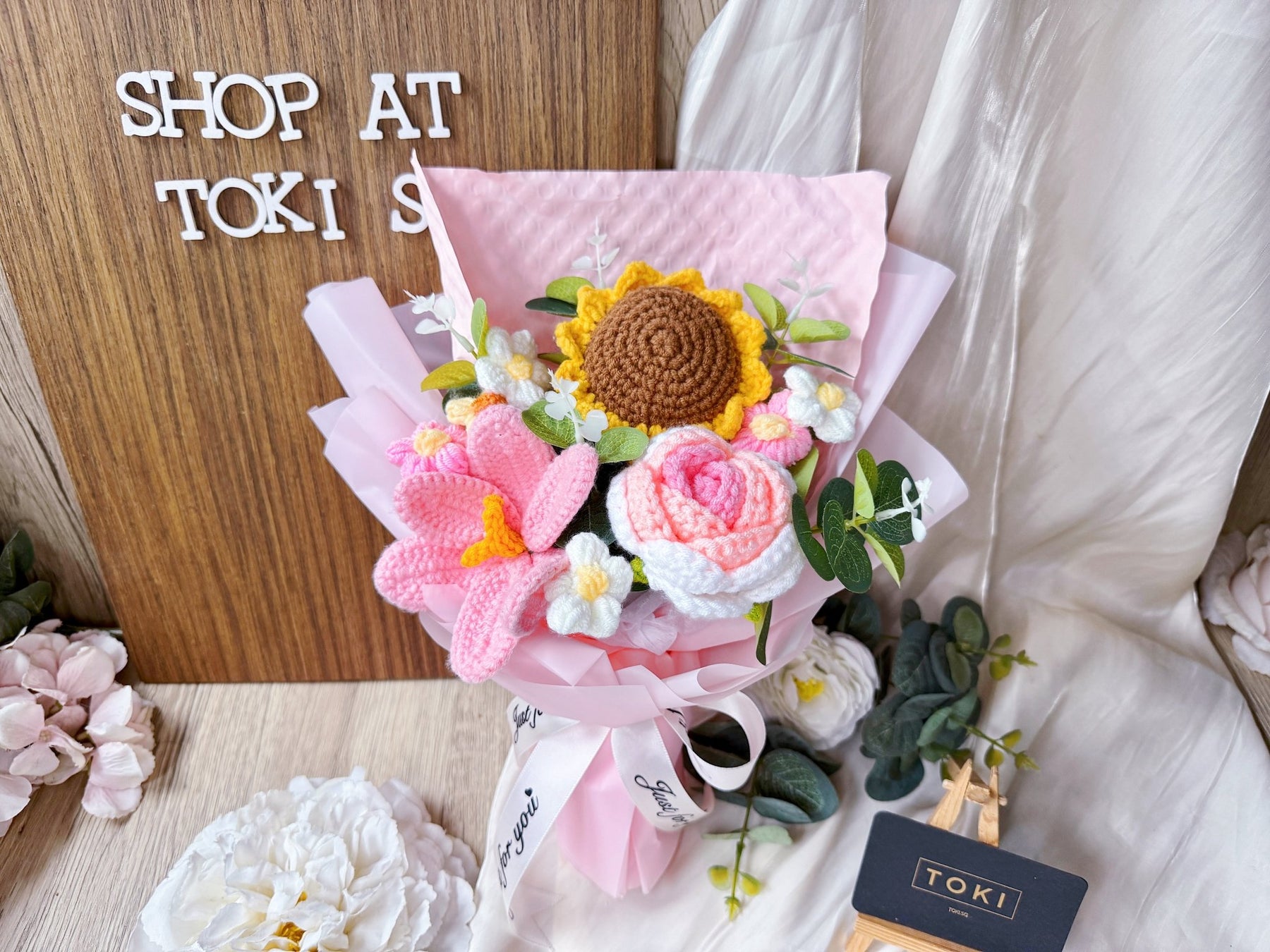 TOKI - Crochet Sunflower, Lily & Rose Bouquet - Pink, Flowers, Birthday / Graduation