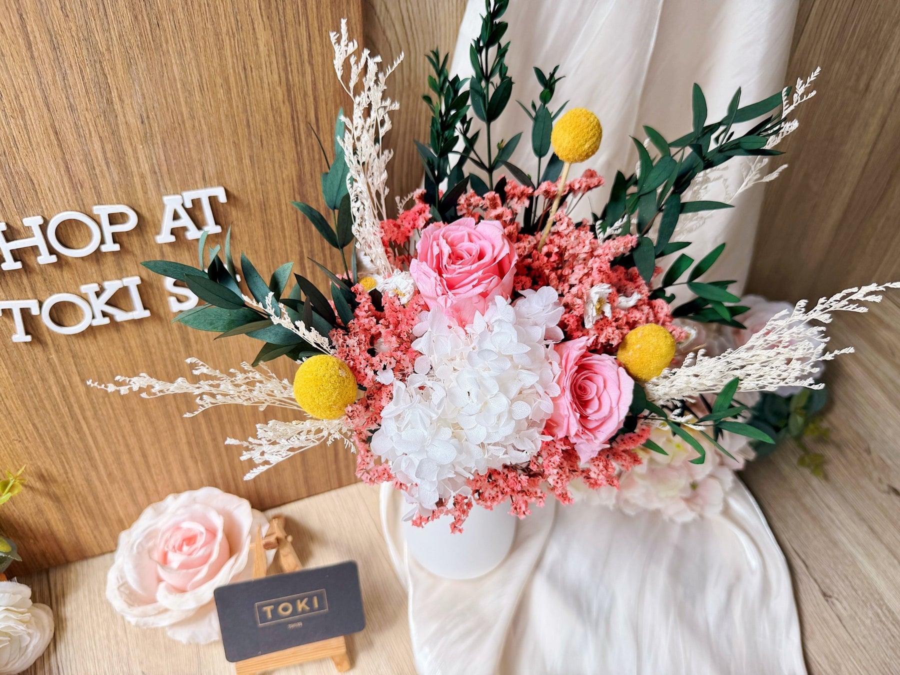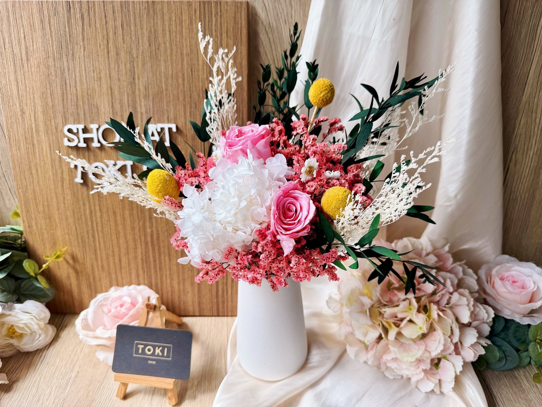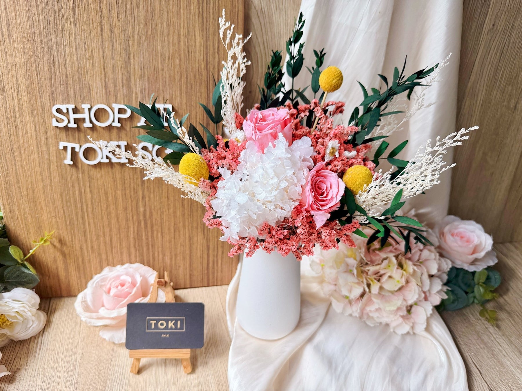Elevate your space with this timeless floral arrangement featuring two preserved roses paired with hydrangea and eucalyptus leaves. Each bloom is carefully selected and arranged in a simple white vase, creating a sophisticated centerpiece that brings natural beauty into your home. Preserved flowers require minimal care while maintaining their vibrant appearance for months, making this the perfect choice for those seeking lasting elegance without the upkeep of fresh blooms.