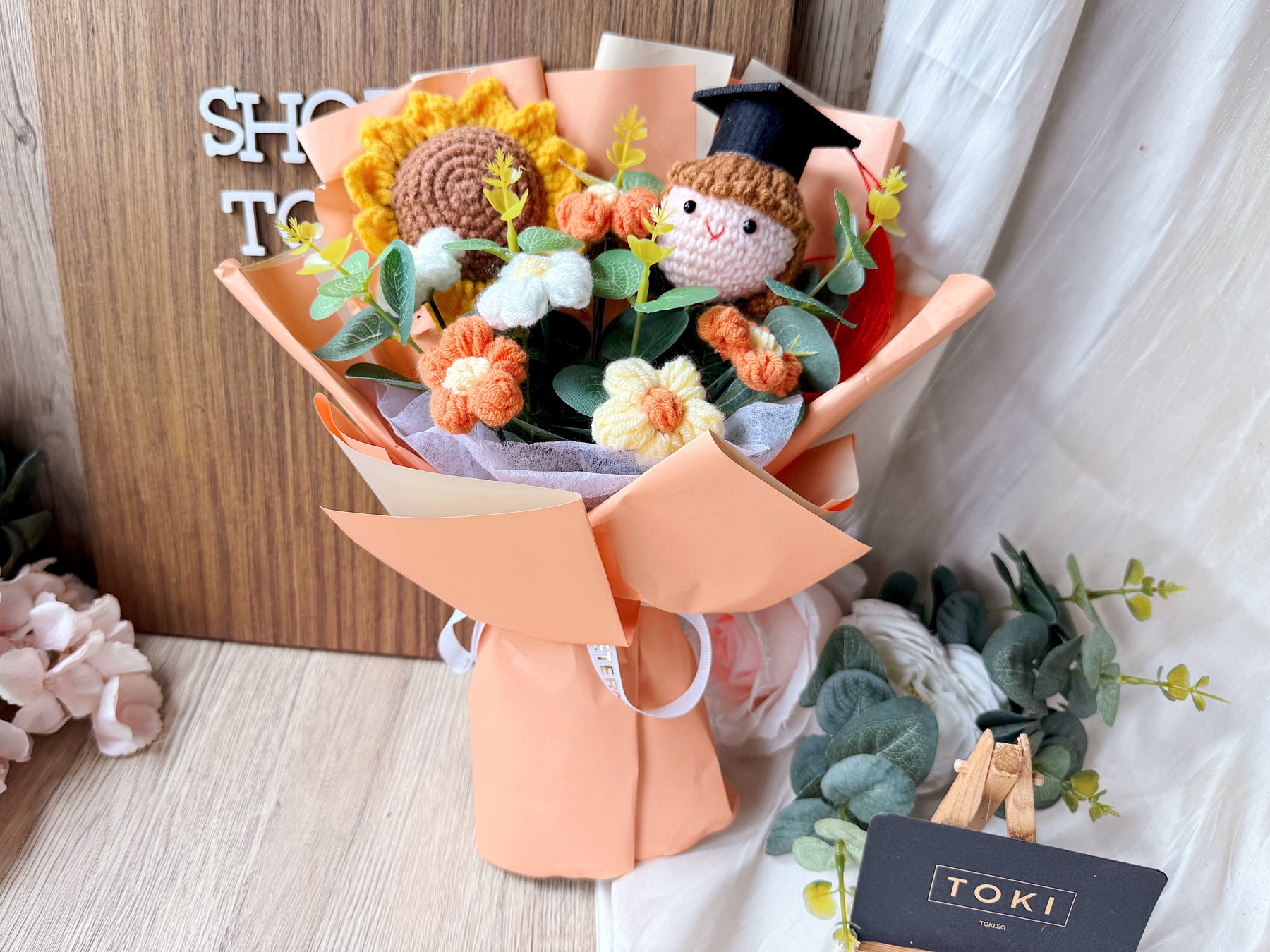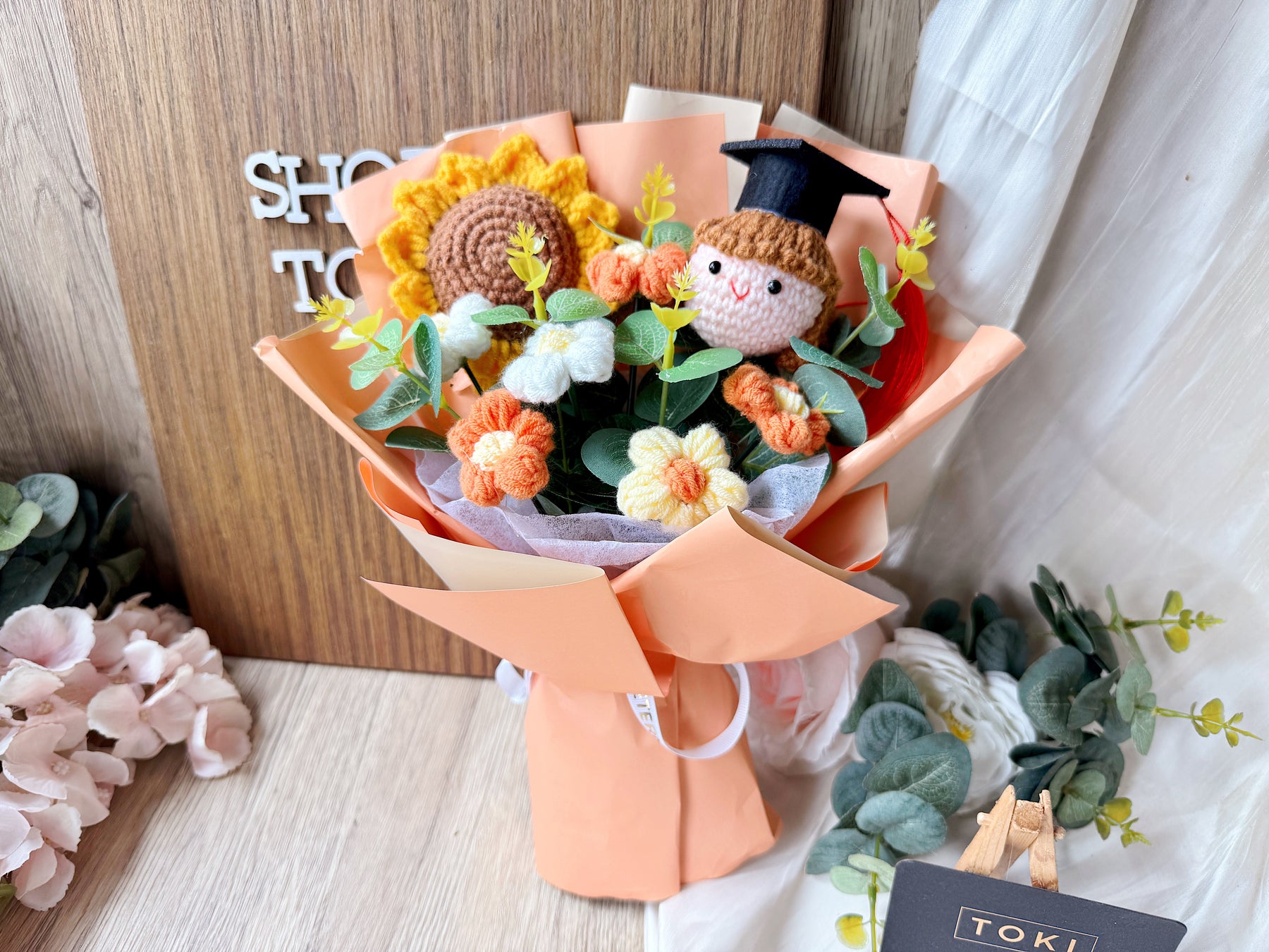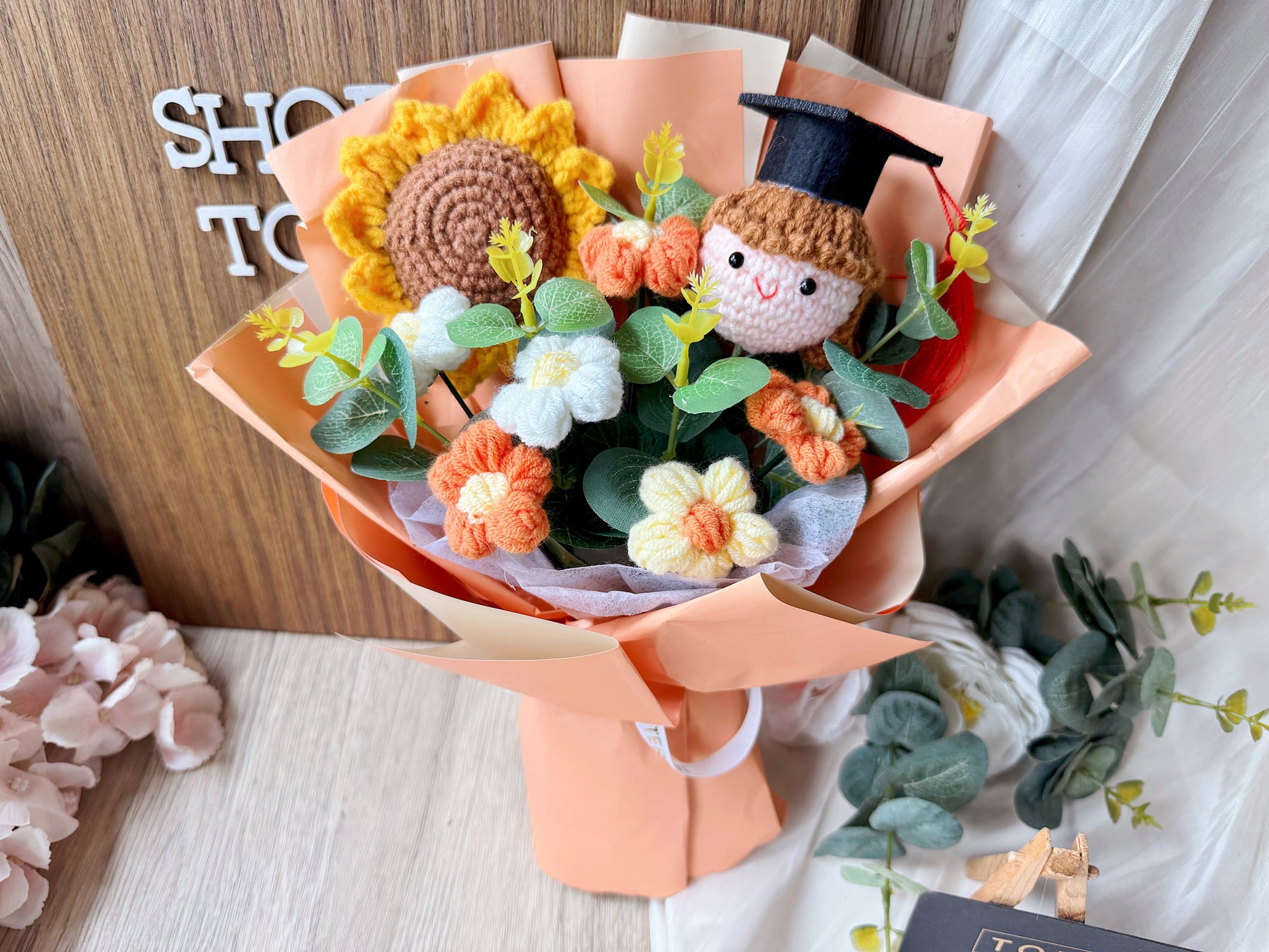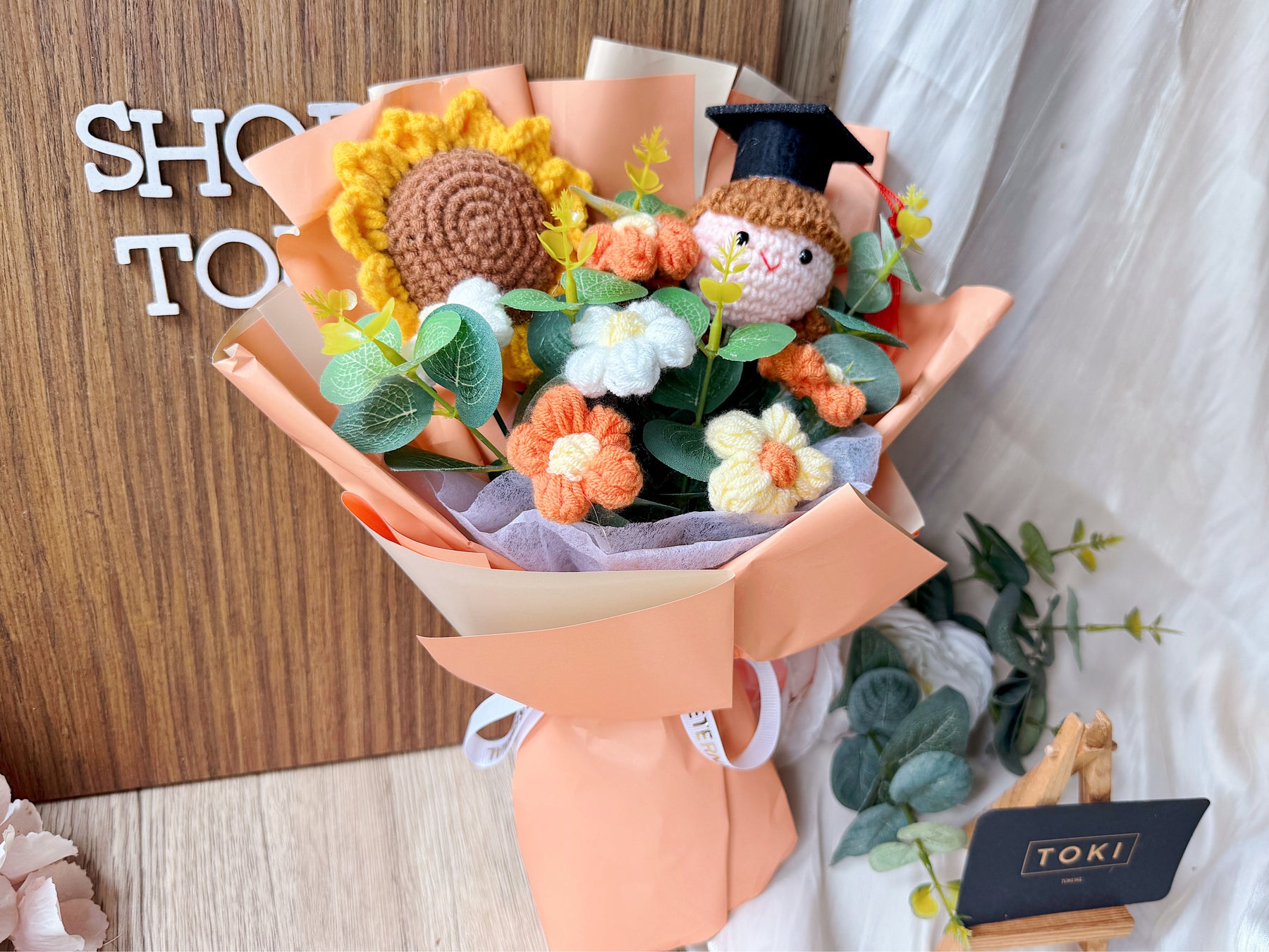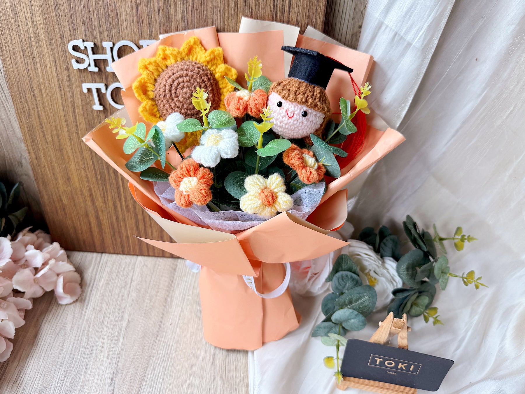This stunning crochet sunflower bouquet is perfect for celebrating your graduate's special day! The crochet graduate also makes a sweet addition to the display of uniqueness and pride. This unique combination of thoughtful sentiments is sure to make a lasting impression.