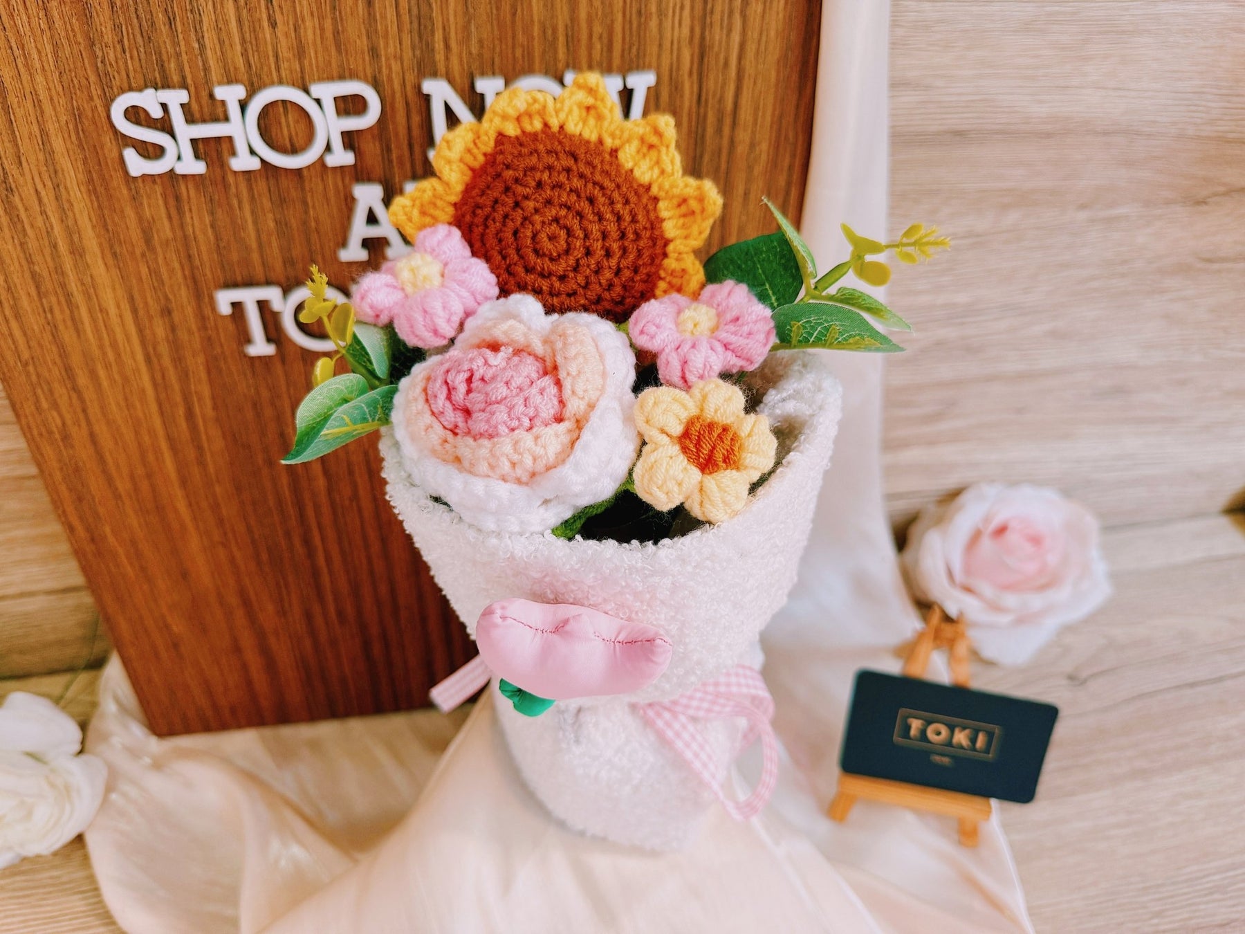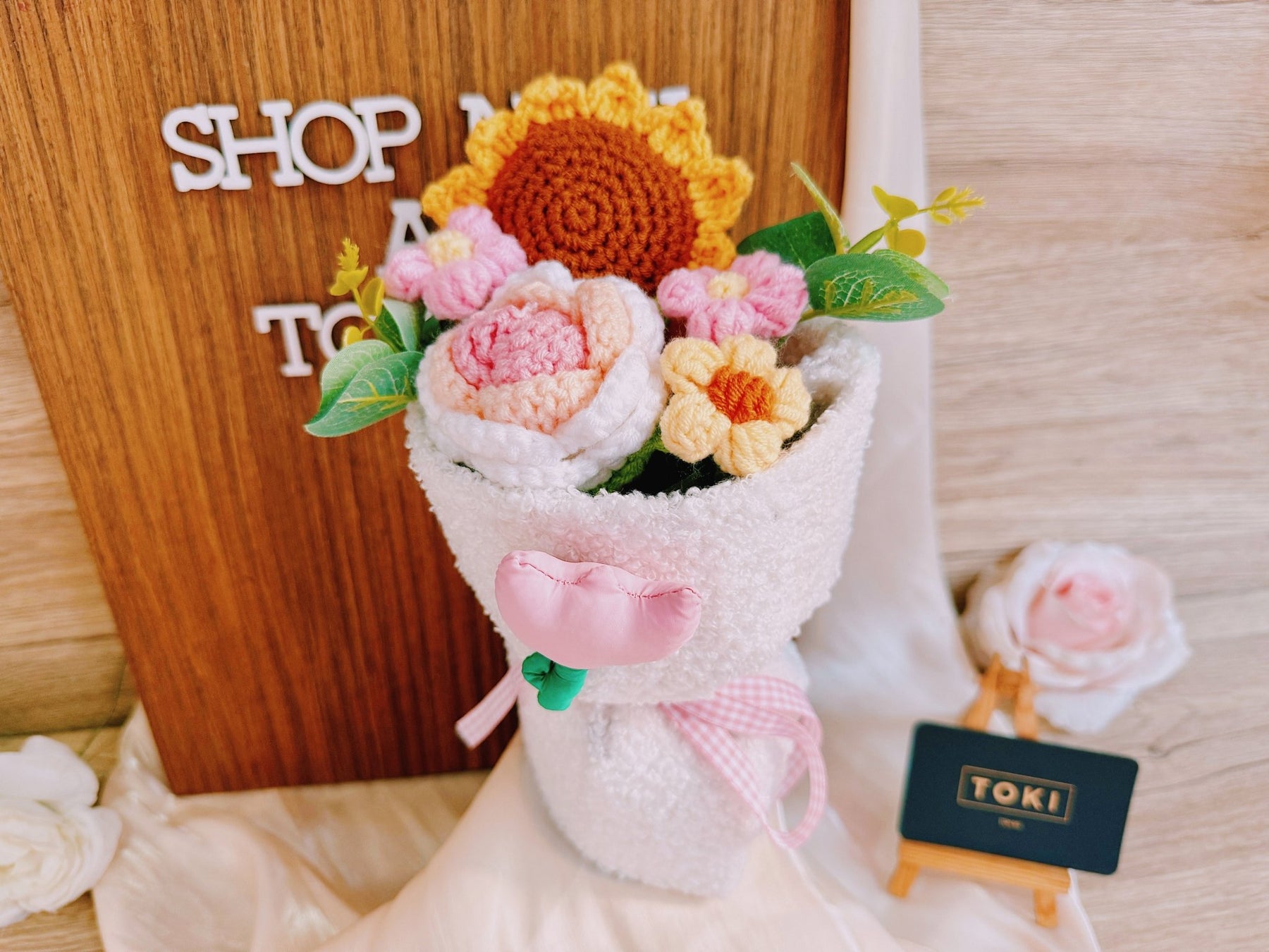 This mini crochet sunflower bouquet includes a cheerful rose and three small flowers. Perfect for children or just to brighten someone's day. Get ready to smile! 🌻🌹💐
