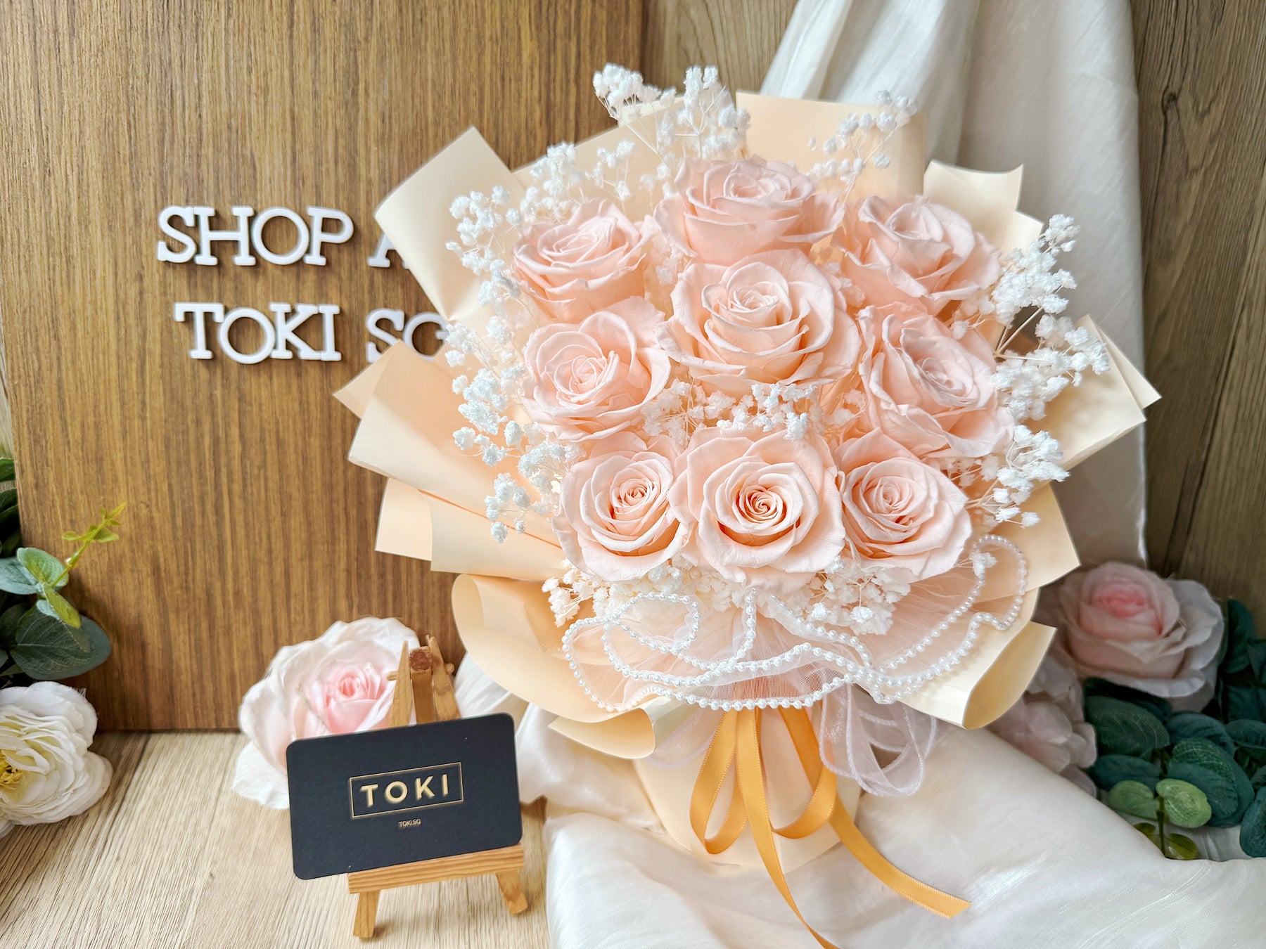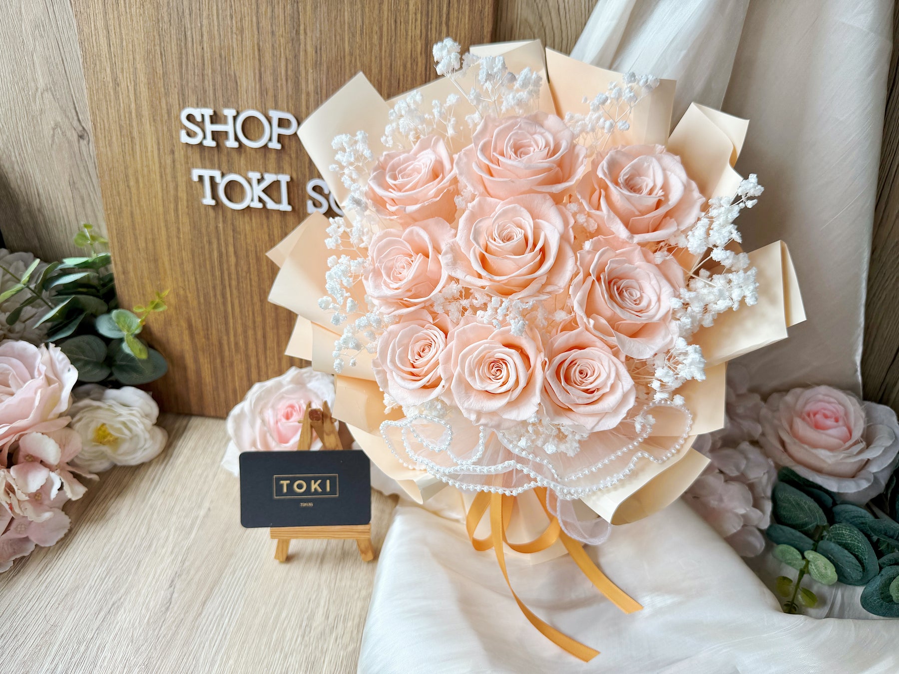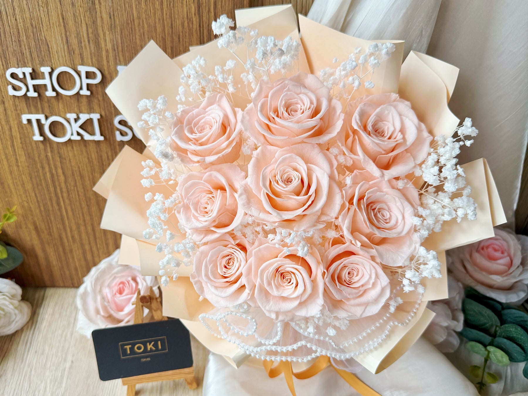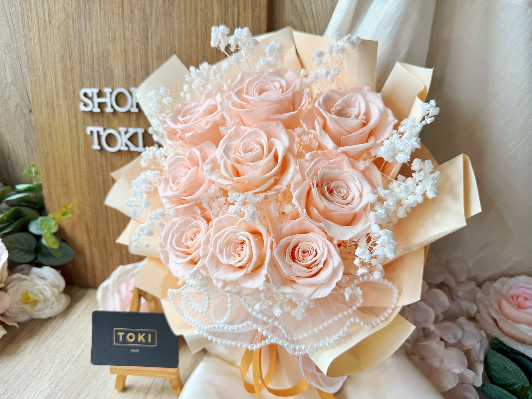 Eternal beauty captured in a timeless bouquet. Nine preserved roses paired with delicate baby breath create an effortless, classic arrangement that lasts for months. Perfect for expressing love, gratitude, or simply brightening any space. Each bloom is carefully preserved to maintain its natural elegance without the need for water or maintenance. A gift that endures.